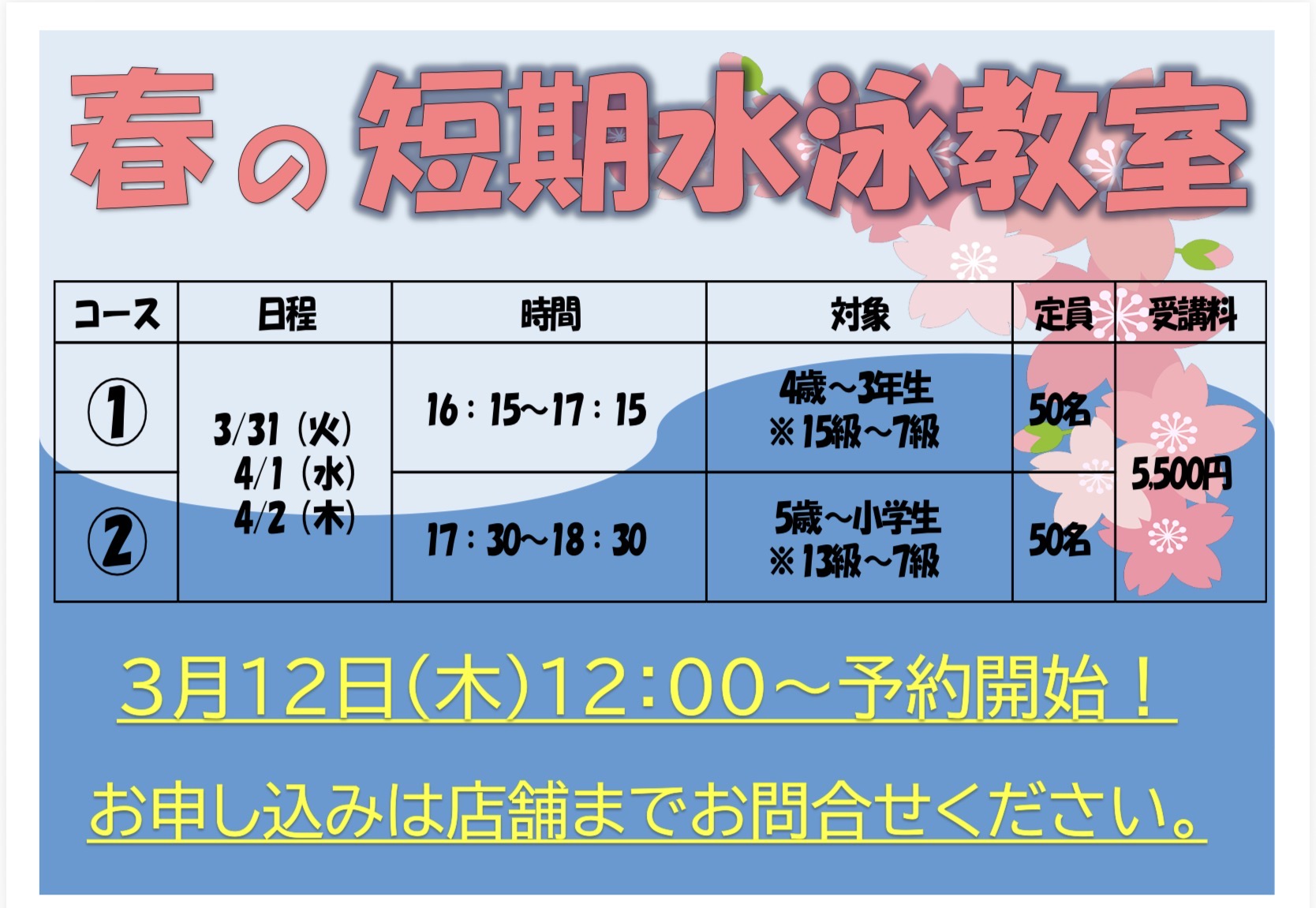 子どもスイミングスクール 春の短期教室の開催をいたします!!